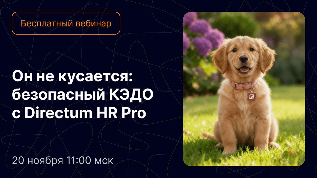20 ноября в 11:00 мск пройдет бесплатный вебинар «Он не кусается: безопасный КЭДО с Directum HR Pro». Эксперты Directum Александр Быков и Иван Нагорнов покажут, как технологии помогают бизнесу предотвратить утечки и сохранить данные.