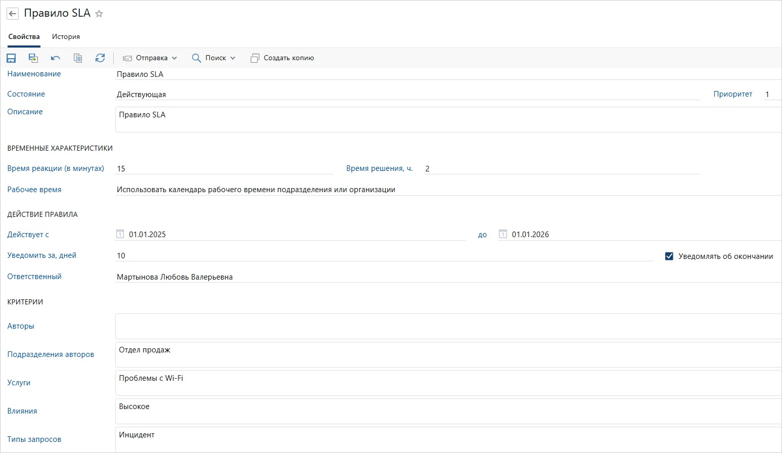 Для каждого типа обращений настраивается SLA (Service Level Agreement) — соглашение о том, как быстро