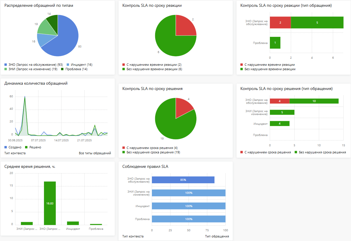 В отличие от хелп деска сервис деск имеет развитую отчетность. В некоторых системах можно посмотреть загрузку по команде, частые обращения, оценку качества в реальном времени на виджетах.