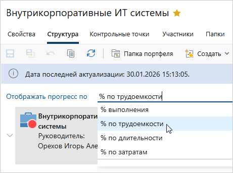 Кроме того, автоматизируется учет затрат и трудоемкости. Данные рассчитываются по дочерним портфелям, программам и проектам.