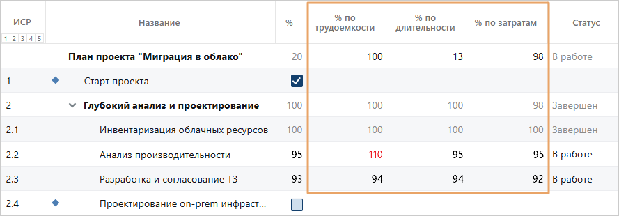 Процент выполнения по трудоемкости, длительности и затратам отображается в карточках проекта и плана. Прогресс по этим показателям также можно отслеживать для портфелей и программ.