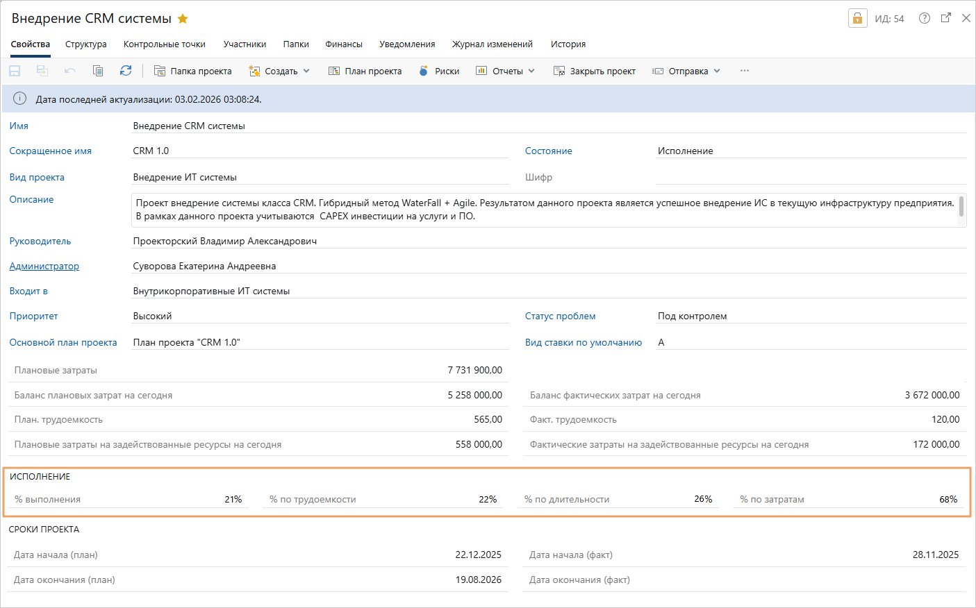 Полная информация о затратах проекта с учетом его финансовых операций отображается в карточке проекта и его плана.