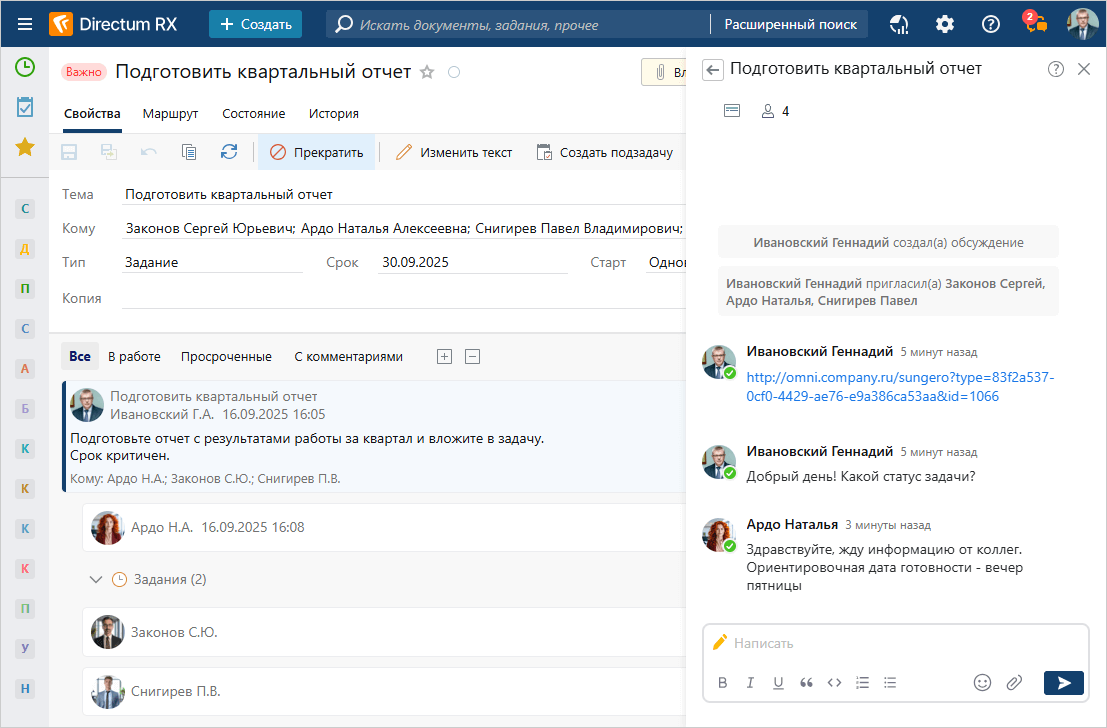 Для срочных вопросов есть встроенный мессенджер, где прямо из чата можно перейти к документу или любому другому объекту. Если обсуждается конкретная задача, система предложит ответственных по ней в качестве возможных собеседников.