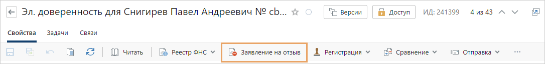 Кнопка «Заявление на отзыв» в карточке электронной доверенности