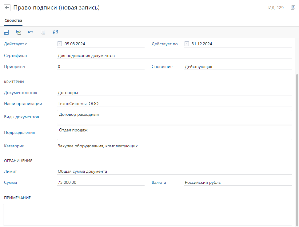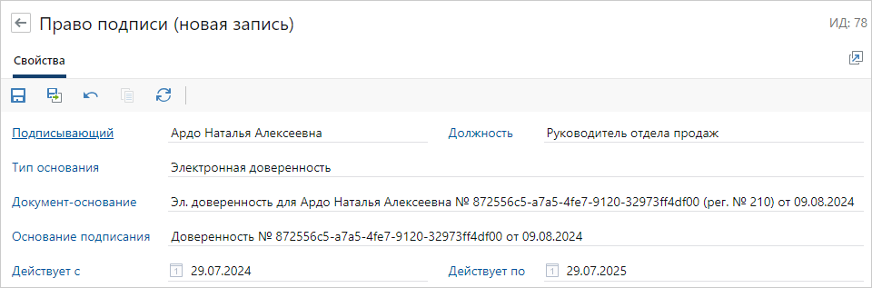 Чтобы сотрудники могли подписывать документы на основании доверенности, администратору достаточно настроить право подписи. При этом в карточке права подписи автоматически заполняются данные о сотруднике, которому выдана доверенность, а также указывается период ее действия.