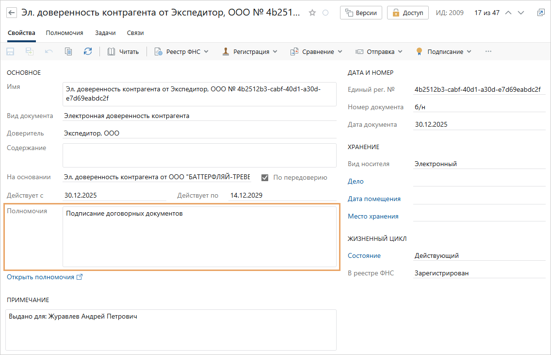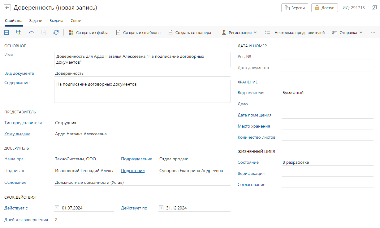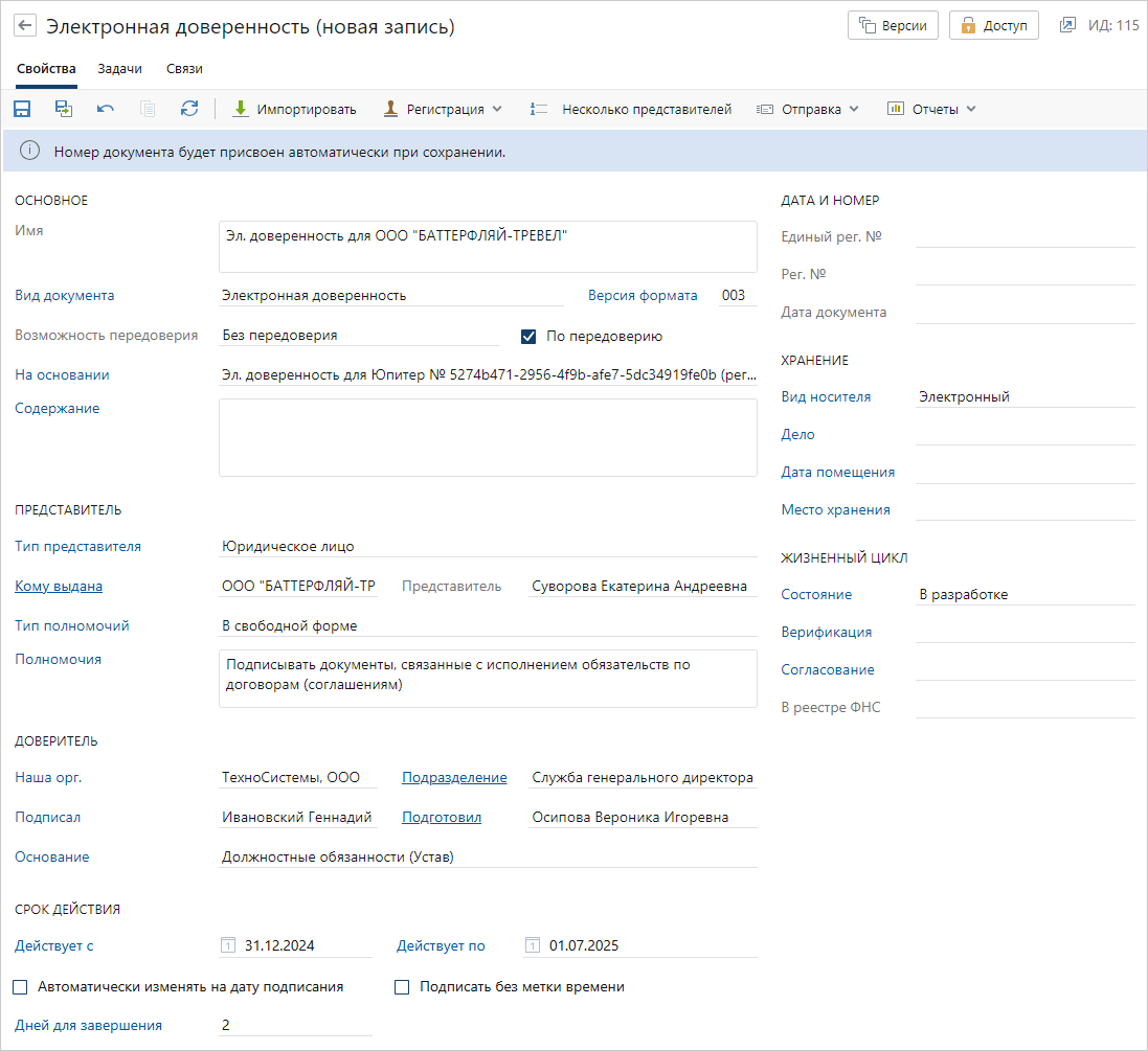 При создании все реквизиты добавляются в доверенность автоматически. В карточке документа сотрудник указывает одного или нескольких представителей и доверителя, задает срок действия и выданные полномочия. Их можно указать вручную или выбрать из справочника. В нем содержатся актуальные данные, импортируемые из единого классификатора Минцифры.