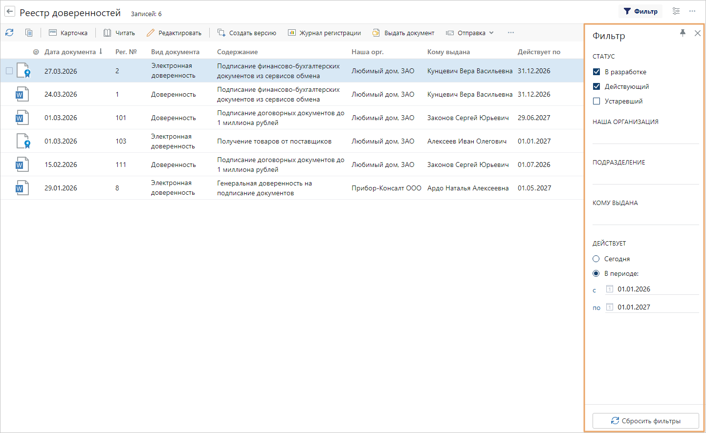 Чтобы быстро найти нужные документы в реестре, список можно отфильтровать по сотруднику, периоду действия и другим критериям: