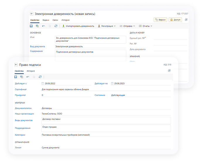Право подписи можно ограничить. Например, разрешить сотруднику подписывать договоры с суммой только до 1 миллиона рублей. Эти условия сопоставляются с полями карточки подписываемого документа. Если они совпадают, сотрудник может заверить документ своей электронной подписью.