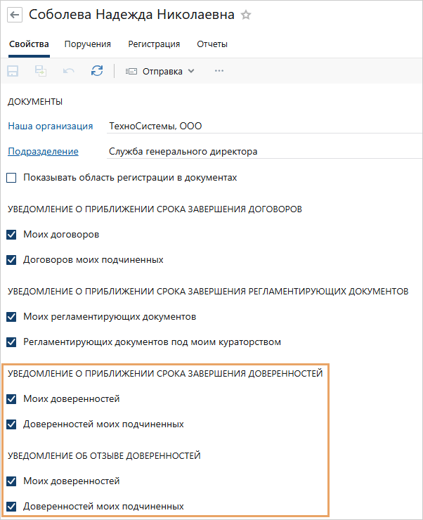 За несколько дней до завершения доверенности уведомление придет сотруднику, которому выдана доверенность, его руководителю или автору документа. Таким образом, можно избежать ситуации, когда важные документы оказываются неподписанными из-за истекшего срока: