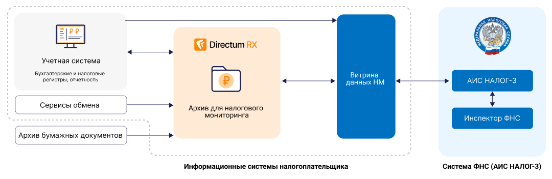 Финансовый архив Directum интегрируется с витринами данных или напрямую с АИС «Налог — 3». Через них инспектор ФНС получает доступ к первичным учетным документам компании: бумажным и электронным. Это снижает нагрузку на бухгалтеров, ускоряет взаимодействие и повышает прозрачность контактов с налоговой.